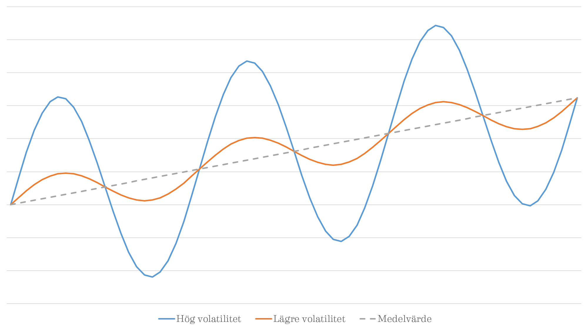 En av anledningarna till att jag är förtjust i RikaTillsammans-portföljen trots att den över tid presterar sämre än ett aktieindex (läs mer här) är att volatiliteten är låg. Det betyder att den inte svänger särskilt mycket, varken upp eller ner. Nedanstående bild försöker illustrera det här.