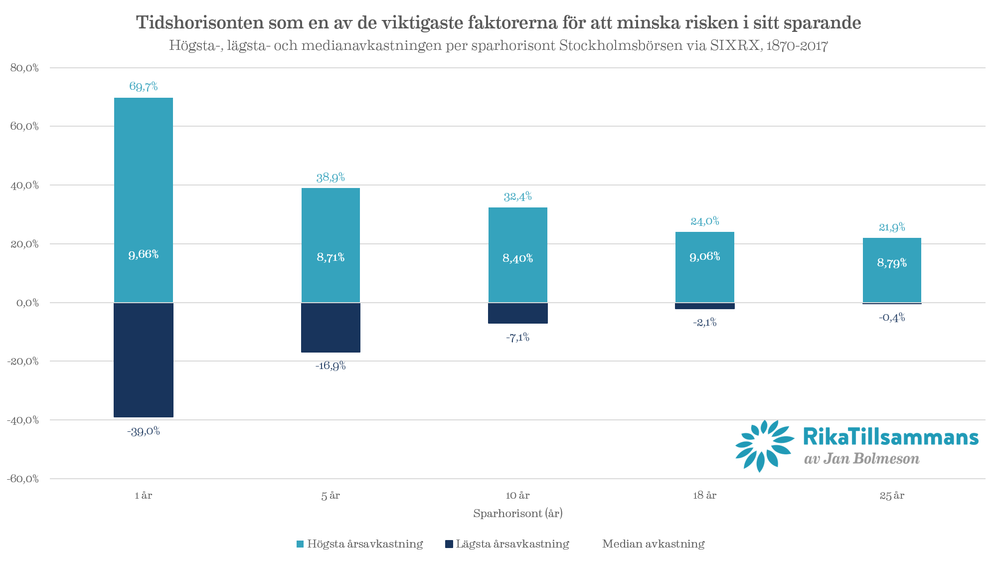 Tidshorisonten som en av de viktigaste faktorerna för att minska risken i sitt sparande Högsta-, lägsta- och medianavkastningen per sparhorisont Stockholmsbörsen via SIXRX, 1870-2017