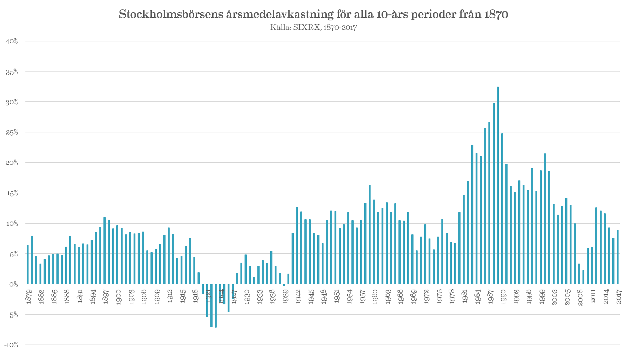 Stockholmsbörsens utveckling med en 10-års sparhorisont 1870-2017