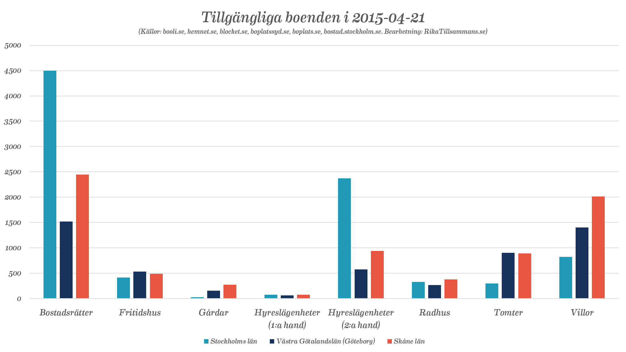 Dessa har nästan blivit en sanning eftersom de har upprepats så många gånger. Andra bloggare, med framförallt Lars Wilderäng på Cornucopia har gjort ett fantastiskt jobb i att visa att dessa argument inte överhuvudtaget håller vid en närmare granskning. Det absolut vanligaste argumentet som brukar föras fram är att vi har en bostadsbrist. Tittar man på antalet tillgängliga bostäder i form av första- och andrahandskontrakt, bostadsrätter, villor och radhus, så ser det ut som följer i skrivande stund: