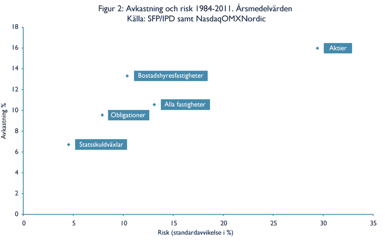 Min invändning till den här grafen är att jag spontant tycker att volatiliteten är lite missvisande för aktierna. Ett enskilt år kan ju volatiliteten i aktier vara ganska stor, i enlighet med grafen. Däremot räknar man på ackumulerade tidsperioder så minskar den ganska drastiskt. Läs mer i min artikel: