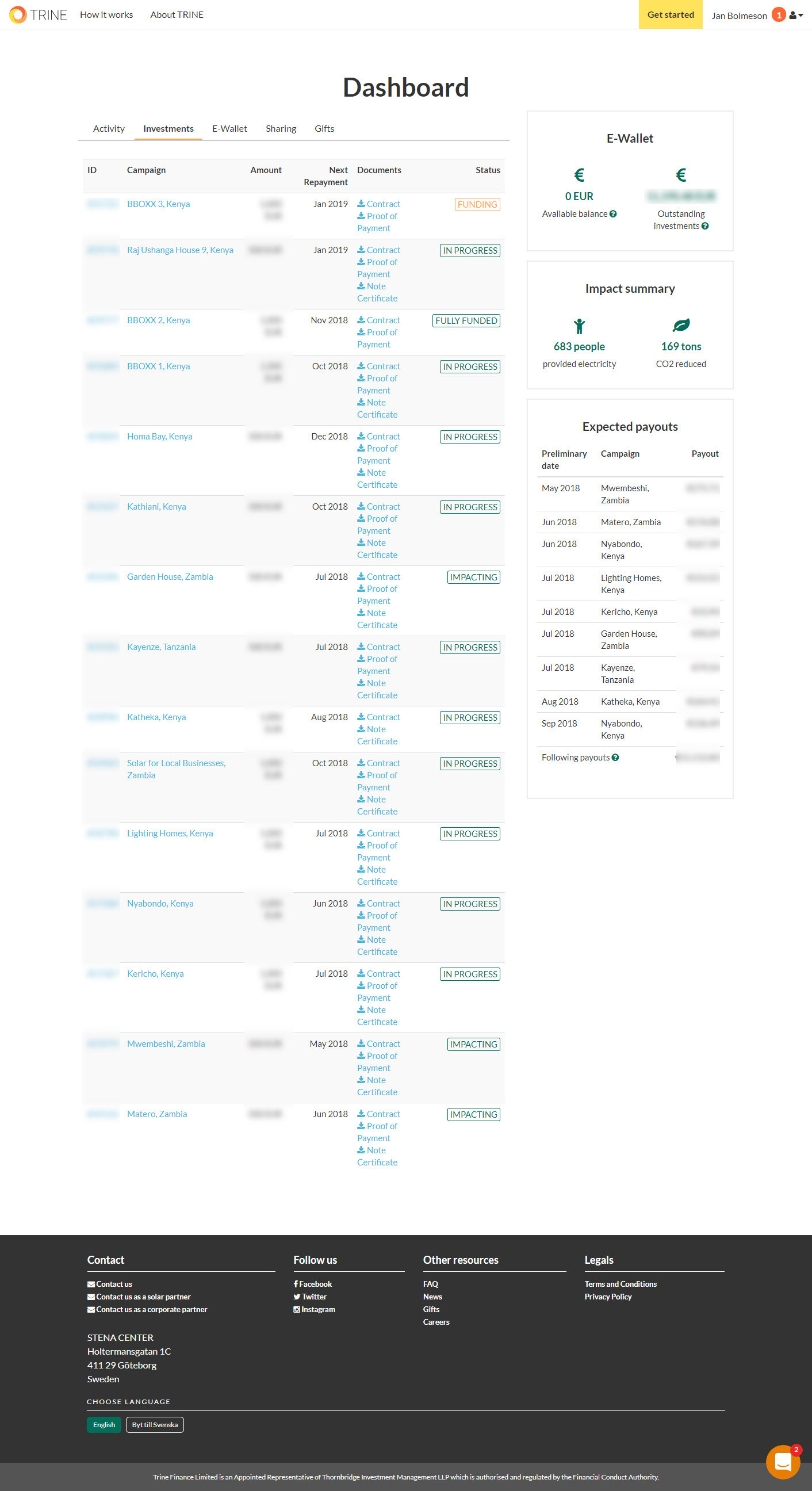 Jag tycker det är viktigt att visa att jag lever som jag lär, särskilt när det gäller partnersamarbeten och inte minst de senaste diskussionerna här på bloggen om ämnet jämte min annonspolicy. Nedan följer min översikt hos Trine. Ganska coolt att få reda på att jag har bidragit till att 683 personer har fått elektricitet och en minskning 168 ton koldioxid samtidigt som jag har tjänat ca 5 procents årlig avkastning. :-)