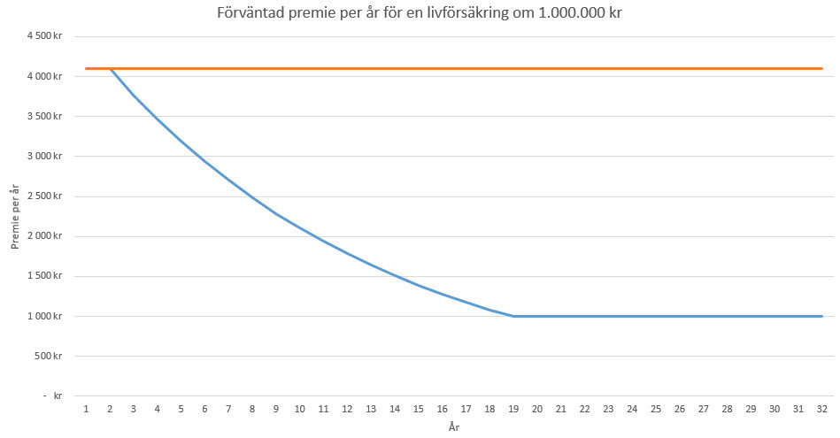 Jag tänkte för enkelhetens skull ta mig själv som exempel. Jag är idag 33 år gammal, jag vill ha ett belopp på 1.000.000 kr och jag vill att det ska gälla från och med idag till min 65 års dag, det vill säga 32 år. Det ger att min premie blir ca 4.100 kr per år som ska betalas i 32 år. Dock, eftersom man räknar med en kalkylränta (ingen garanti, utan förväntning) på 8 % per år så sjunker min avgift över tid, till att efter 19 år till 1.000 kr per år.