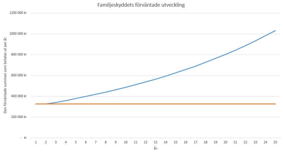 Det vill säga att det förväntade beloppet som försäkringen betalar ut ökar över tid, men faller aldrig under den förutbestämda summan om i det här fallet 360.000 kr. Efter 15 år blir summan t.ex. som betalas ut till de efterlevande 622.000 kr per år i fem år.