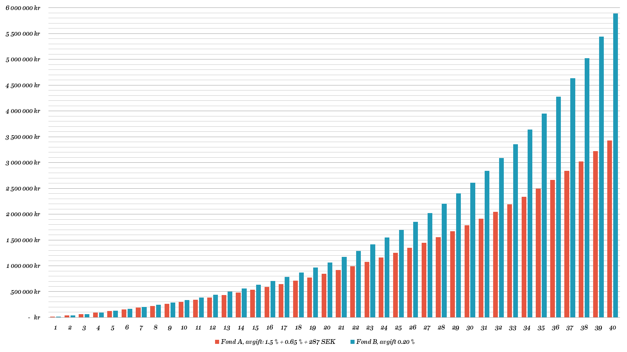 Det blir ganska stor skillnad påstår jag… Det fyrtionde året är det en skillnad på 2 400 000 kr! Gissa vem som har naggat dessa under alla år i det andra fallet…