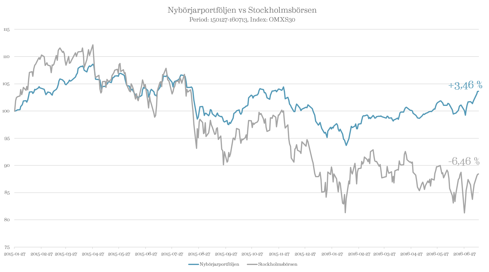Nybörjarportföljen har både hittills i år och de senaste 12 månaderna slagit Stockholmsbörsen med en ganska god marginal. Så här när drygt halva året har passerat är det dags att stämma av hur det har gått och se över eventuella förändringar.
