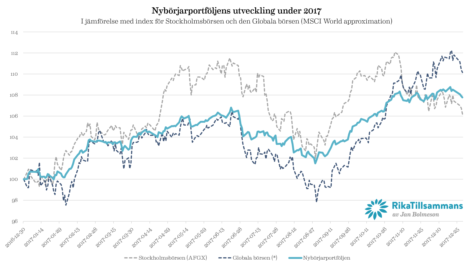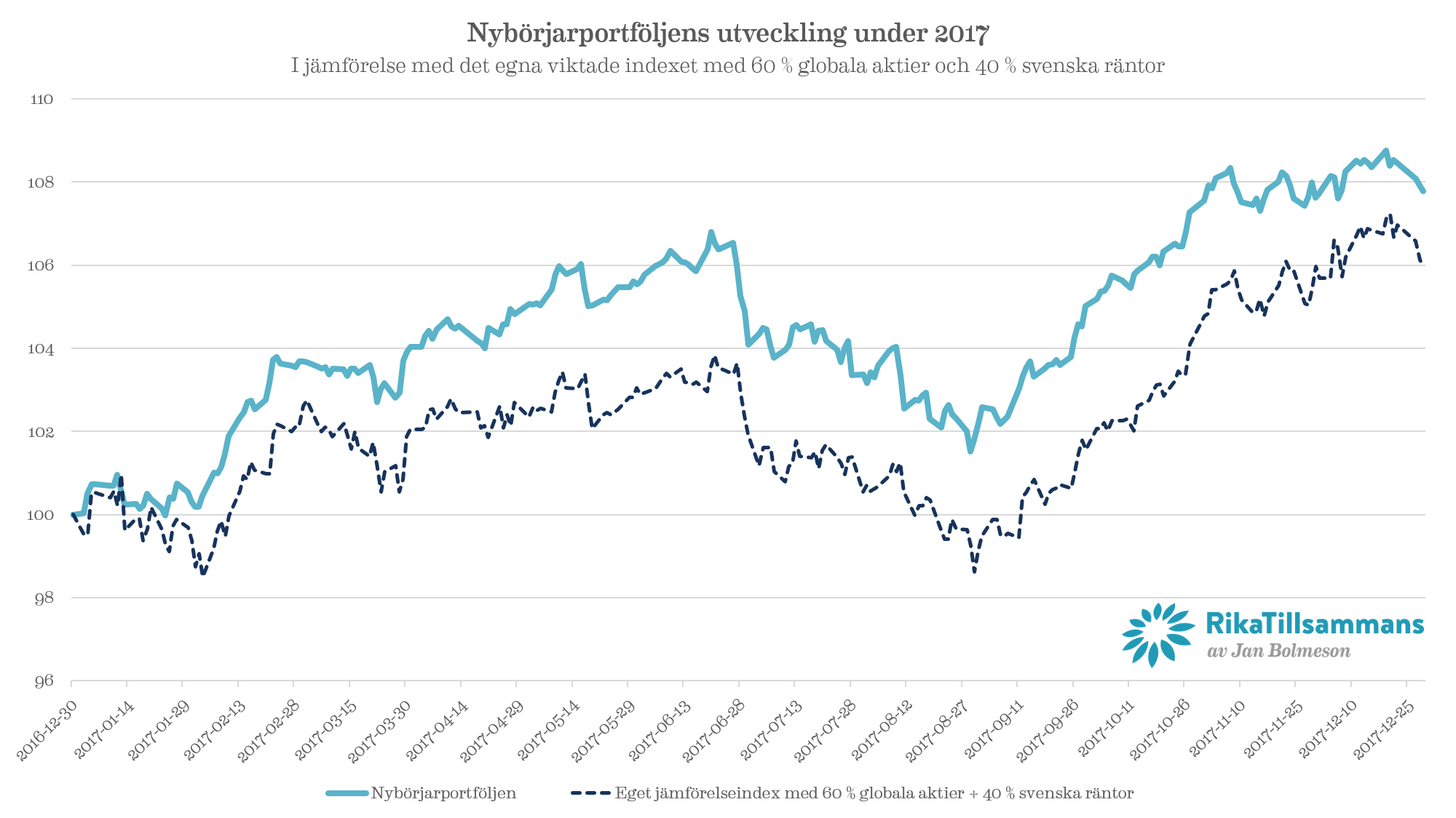 Nybörjarportföljen är en variant på den klassiska 60 % aktieindexfonder och 40 % räntefonder-portföljen. 2017 var ett väldigt bra år för Nybörjarportföljen (+7,7 %) där den till och med slog Stockholmsbörsen med utdelningar (+6,2 %). Något som egentligen inte ska hända då majoriteten av utvecklingen i en portfölj ges av tillgångsslaget och en 100 procent aktier (Stockholmsbörsen) ska alltid slå en portfölj som bara består till 60 procent av aktier.