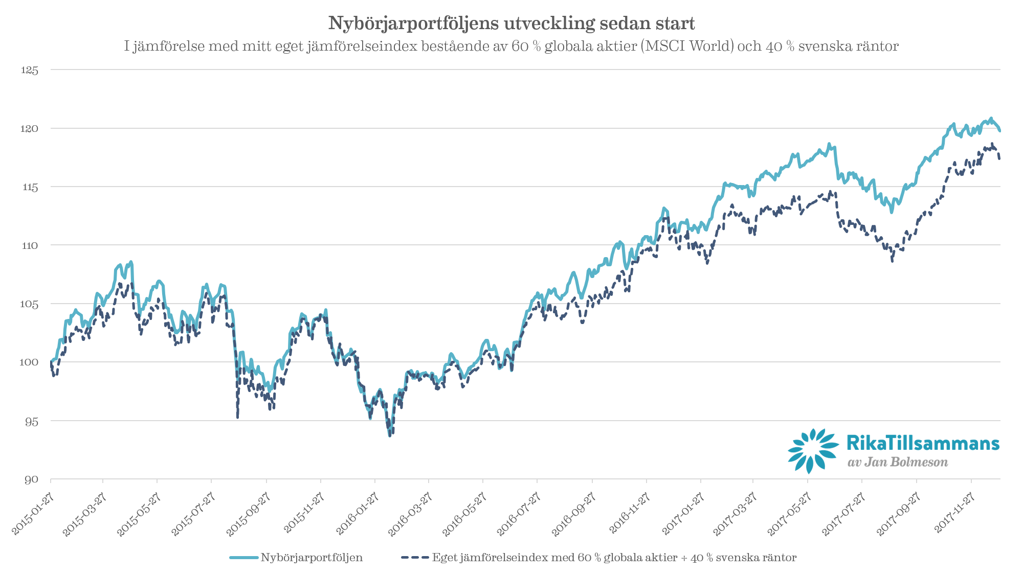 I grafen ovan har jag jämfört Nybörjarportföljen med två andra index: