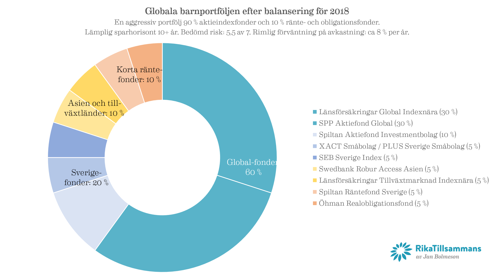 Anledningen till att namnet blev ”globala barnportföljen” är att jag först skrev om den i min bok ”Gör ditt barn rikt” då den lämpade sig väldigt väl för just sparande till barn. Men den fungerar naturligtvis minst lika bra i ett sparande till sig själv, sin pension eller i sitt företag. Det är en ganska aggressiv portfölj med hög, men inte extrem, risk och god möjlighet till avkastning. Fördelningen är 90 procent aktier (läs: indexfonder) och 10 procent ränte- och obligationsfonder. Du kan läsa mer om portföljen här:
