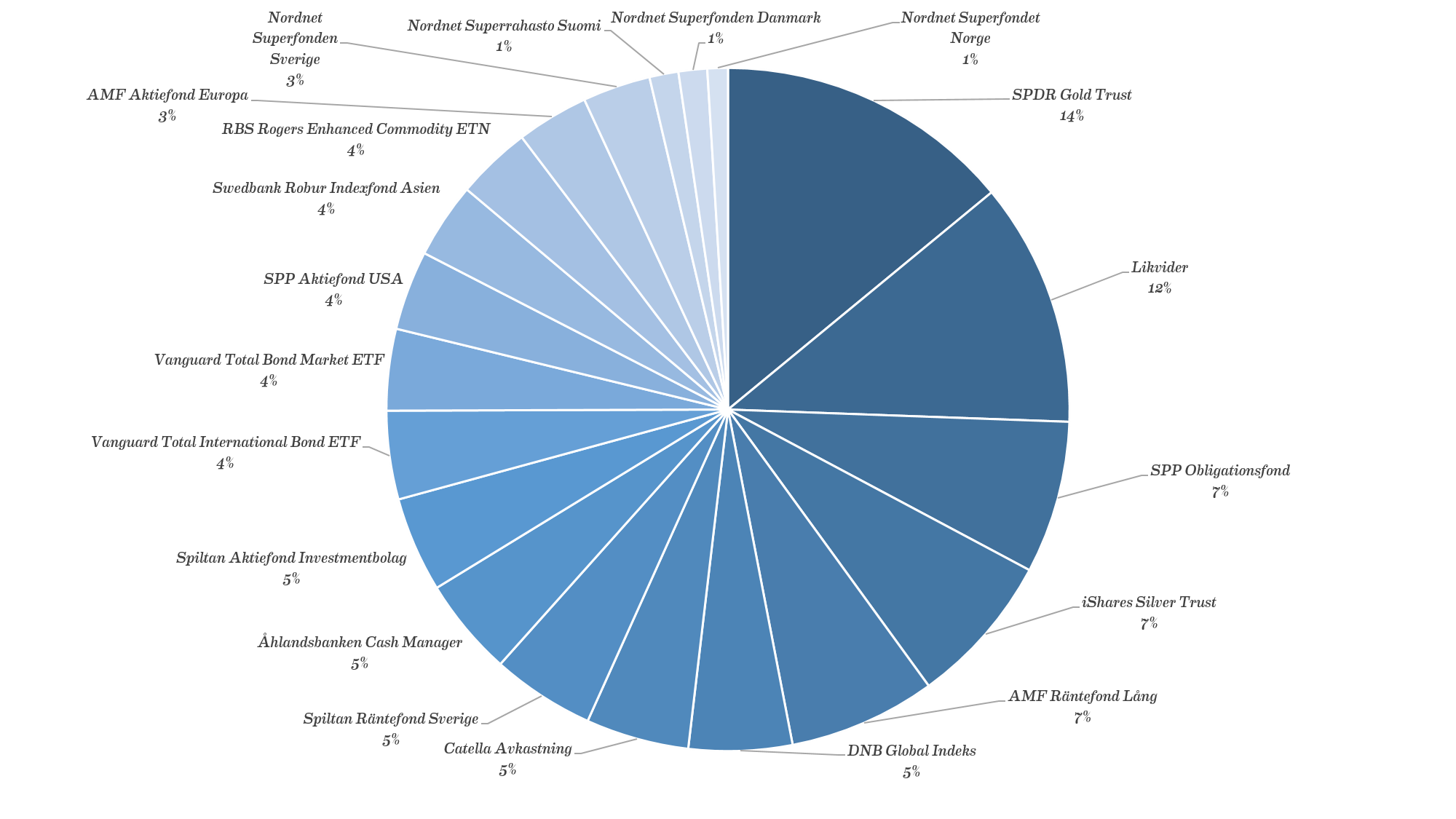 - ca 25 % – Aktier och indexfonder