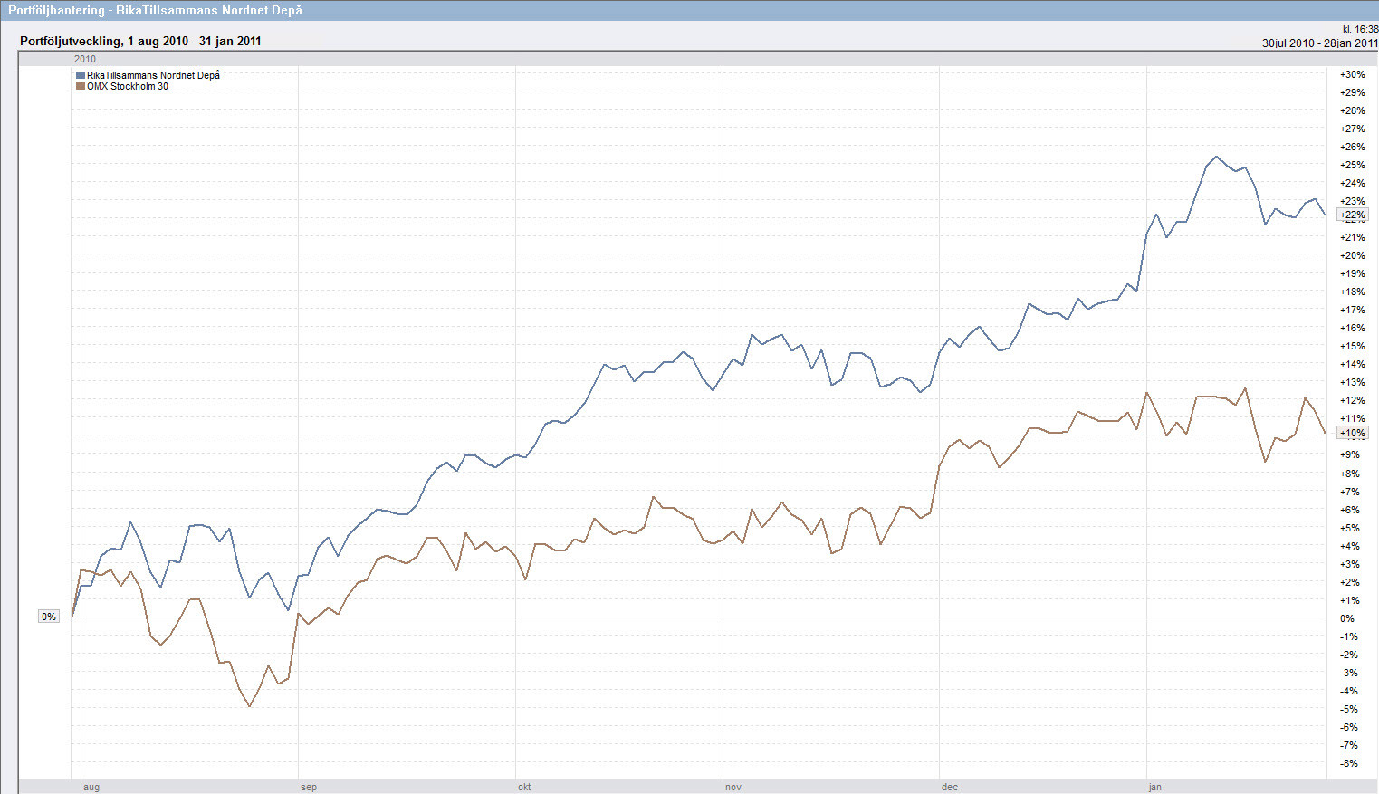 Den blå linjen i grafen nedan visar utvecklingen för aktieklubben medan den bruna linjen visar utvecklingen för jämförelseindexet OMX30.