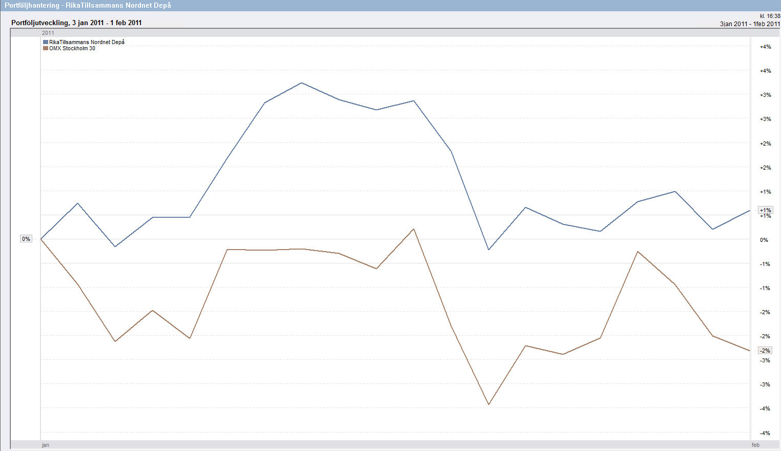 Nedan på bilden ser du utvecklingen under januari månad på aktieklubben i förhållande till vårt jämförelseindex. Enligt nedan så slutade OMX30 på -2% för månaden och vi slutade strax över +1%, det vill säga en skillnad på +3%.
