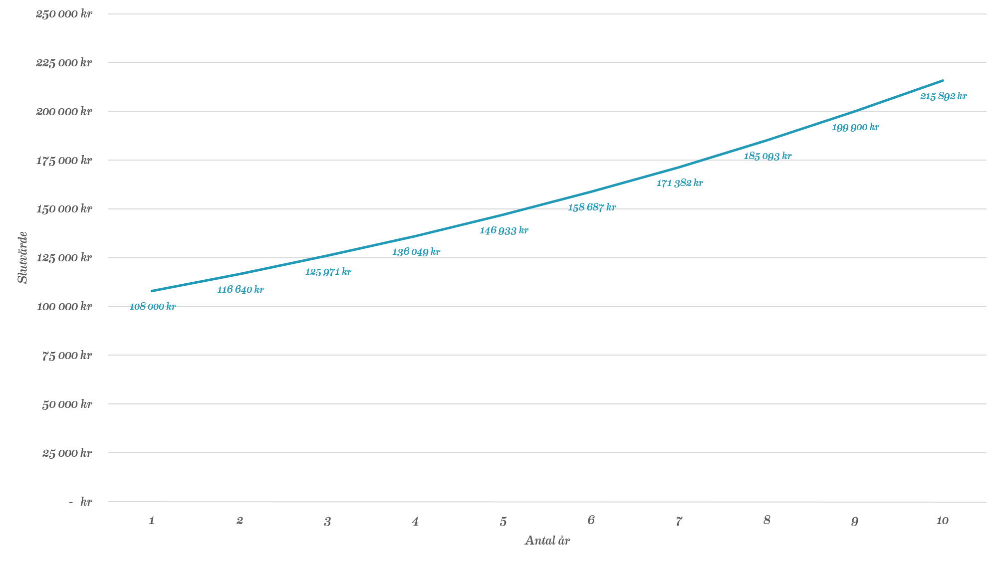 Låt oss ta ett exempel. Erika har 100 000 kr på kontot som hon ska investera till 8 % ränta. Pengarna ska hon låta vara i 10 år. Det betyder att: