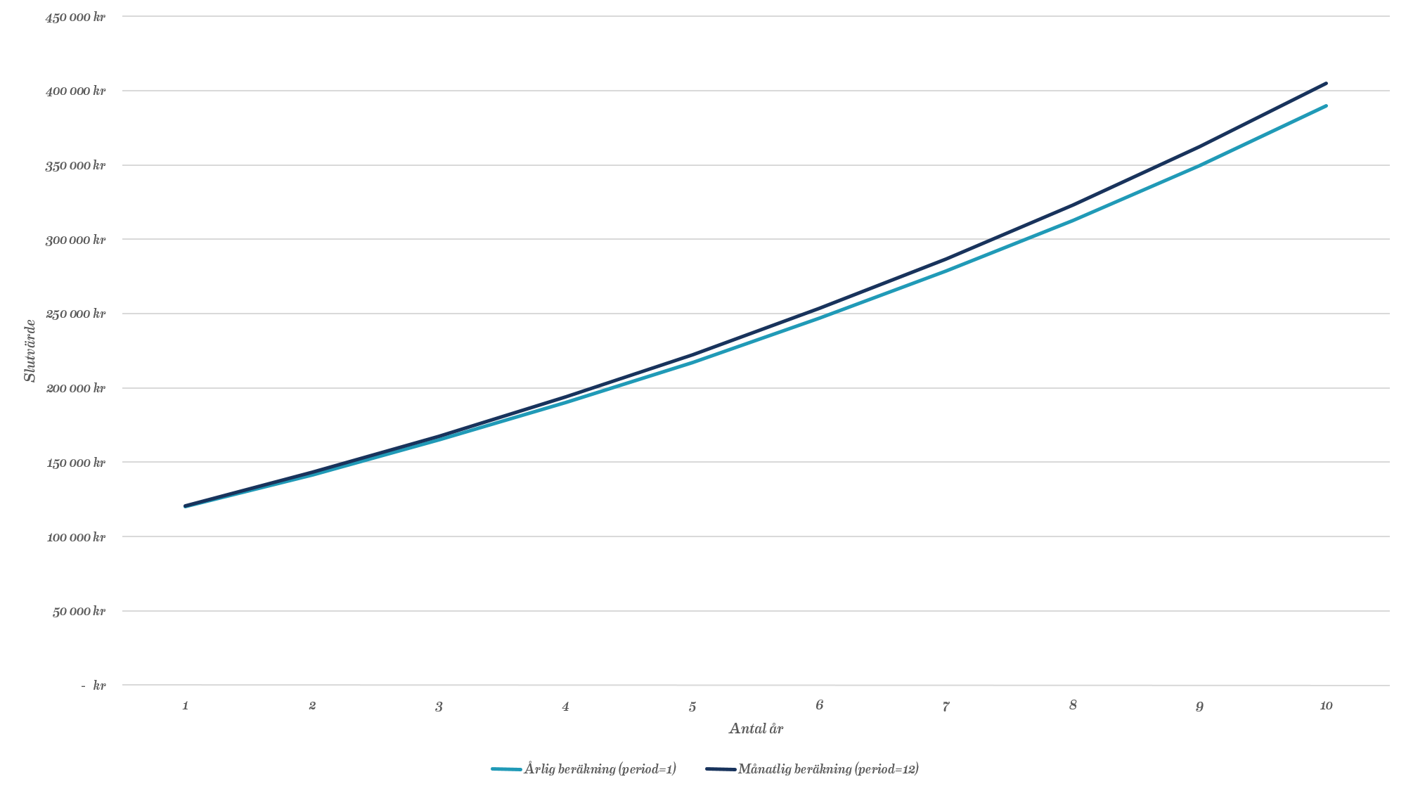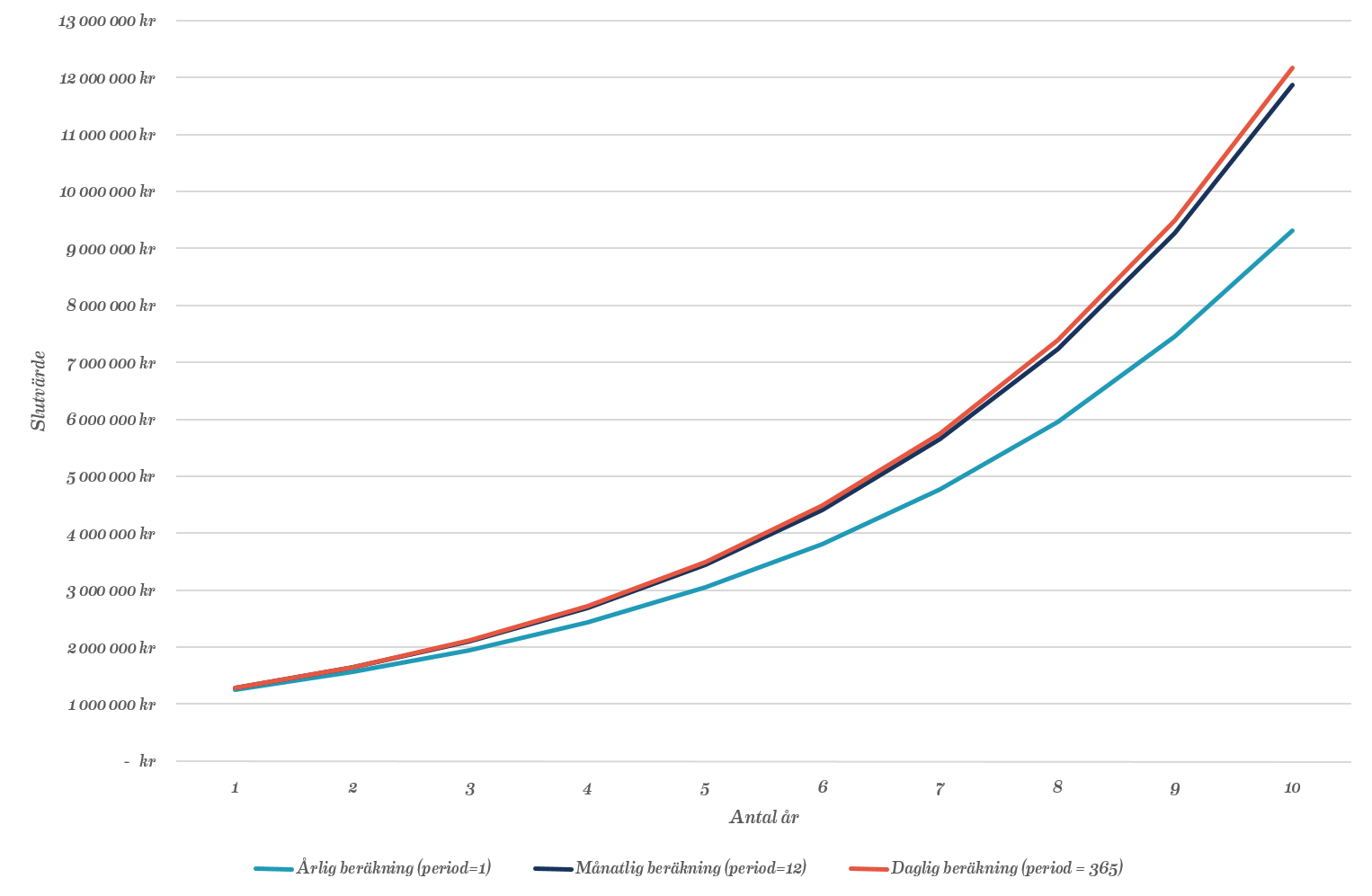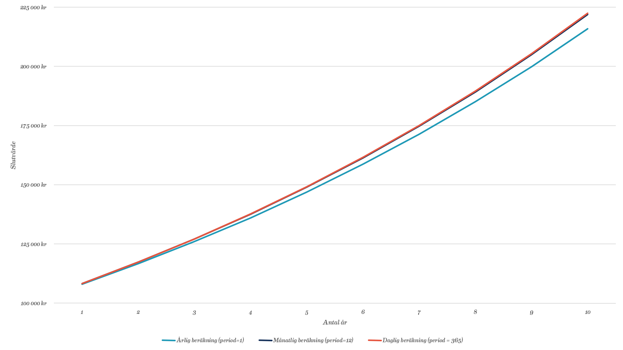 Jag har även ritat in en beräkning på dagsbasis, det vill säga med en period om 365. Den är dock i princip identisk till den månatliga. Skillnaden är mindre än 600 kr mellan den månatliga och dagliga, men 6 072 kr mellan den månatliga och den årliga. Vilket är en ganska stor skillnad.