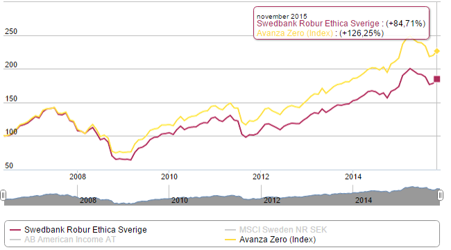 Bilden är tagen från Morningstar och visar jämförelsen sedan 2006 mellan Avanza Zero och Swedbank Robur Ethica. På mindre än 10 år är det över 40 % skillnad i avkastning. Det är bara att göra matten och tänka vem som har får dessa pengar. En ledtråd; det är inte du och jag.