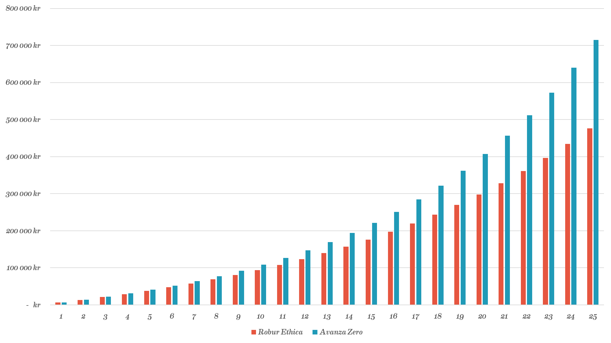 Antagandet i grafen ovan är Robur Ethica Sverige (1.25 % avgift, genomsnittlig avkastning: 9.4 %) och Avanza Zero (0 % avgift, genomsnittlig avkastning: 10.6 %) med 500 kr insättning per månad. Normalt sett tycker jag 9.4 % och 10.6 % är i lite högsta laget, men då jag jämför samma för båda tycker jag det är OK. Jag bortser också här från skatteeffekter, eftersom det är skillnaden som är det intressanta.