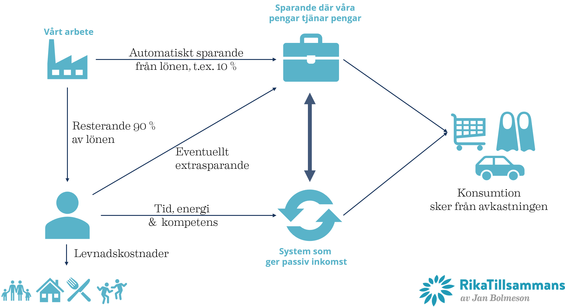 Parallellt är mitt förslag att använda en del av din tid, energi och talang använder du för att börja bygga ett system eller en vattenledning som kan tjäna pengar åt dig när du sover, det som man kallar för en passiv inkomst. Den passiva inkomsten återinvesterar du också i din portfölj – och vice versa om det behövs. När du har fått det här att fungera i ett par år, då kan du använda en del av avkastningen för att konsumera utöver det som du behöver för att få ditt liv att gå runt, då vi finansierar det via vår lön.