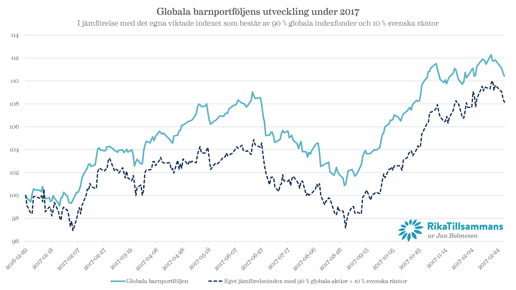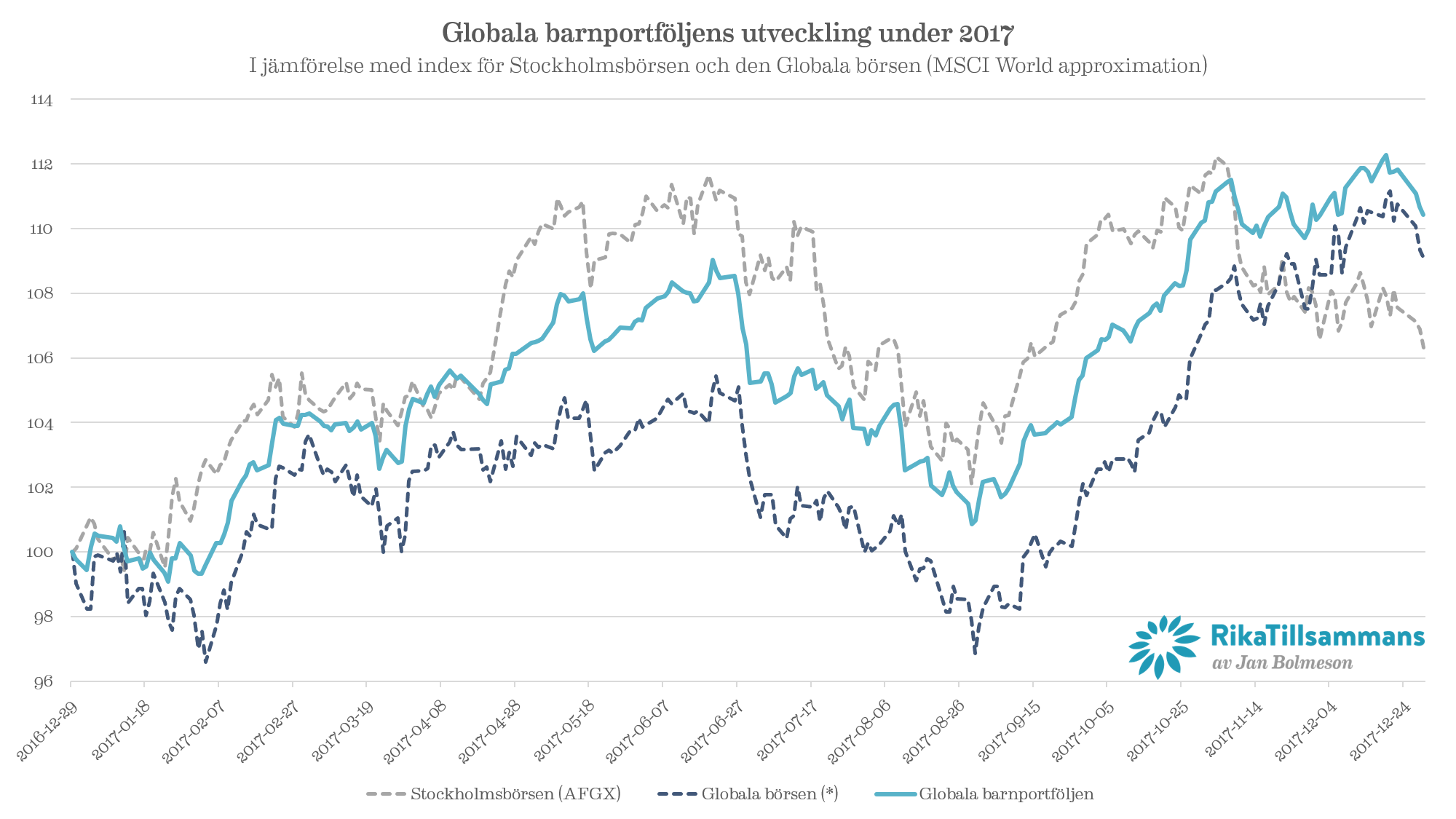 Den globala barnportföljen introducerade jag i samband med lanseringen av boken ”Gör ditt barn rikt (annonslänk)”. Det är en portfölj som lämpar sig för långsiktigt sparande (10+ år) och den består av 90 % indexfonder och 10 % räntefonder. 2017 var ett väldigt bra år för globala barnportföljen (+10,4 %) som slog Stockholmsbörsen med utdelningar (6,2 %) trots att den egentligen inte ska göra det.