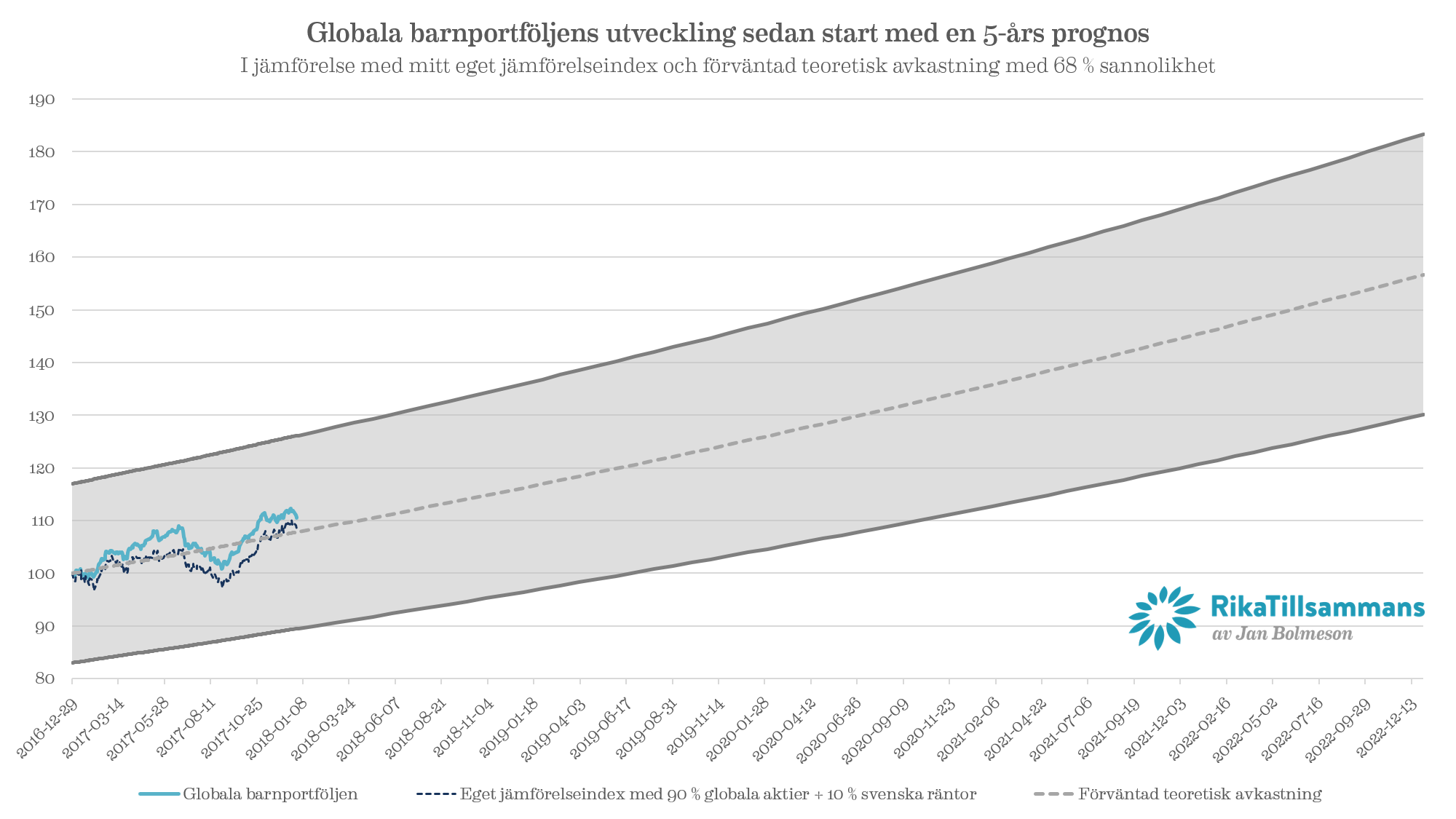 Tolkningen av ovan är att den globala barnportföljen borde alltså med 68 % sannolikhet röra sig inom det grå området på bilden och svänga runt den streckade årsmedelavkastningslinjen. När man tittar på bilden så kan man säga att den mer eller mindre rör sig perfekt runt linjen. Det är få gånger man faktiskt ser ett sådant här skolboksexempel på volatilitet kring en medellinje. Kul!
