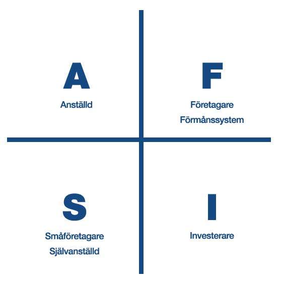 Egentligen borde det vara enkelt – det finns bara fyra sätt att tjäna pengar. Det som inspirerar och förundrar mig är hur tydligt, en persons beteende återspeglas i plånboken. Därav hela den här sajten, som handlar just om ekonomi OCH personlig utveckling. Min övertygelse är att det ena går inte att skilja från det andra. Nedanstående bild är en svensk översättning av Kiyosakis ”Cashflow Quadrant (annonslänk)”: